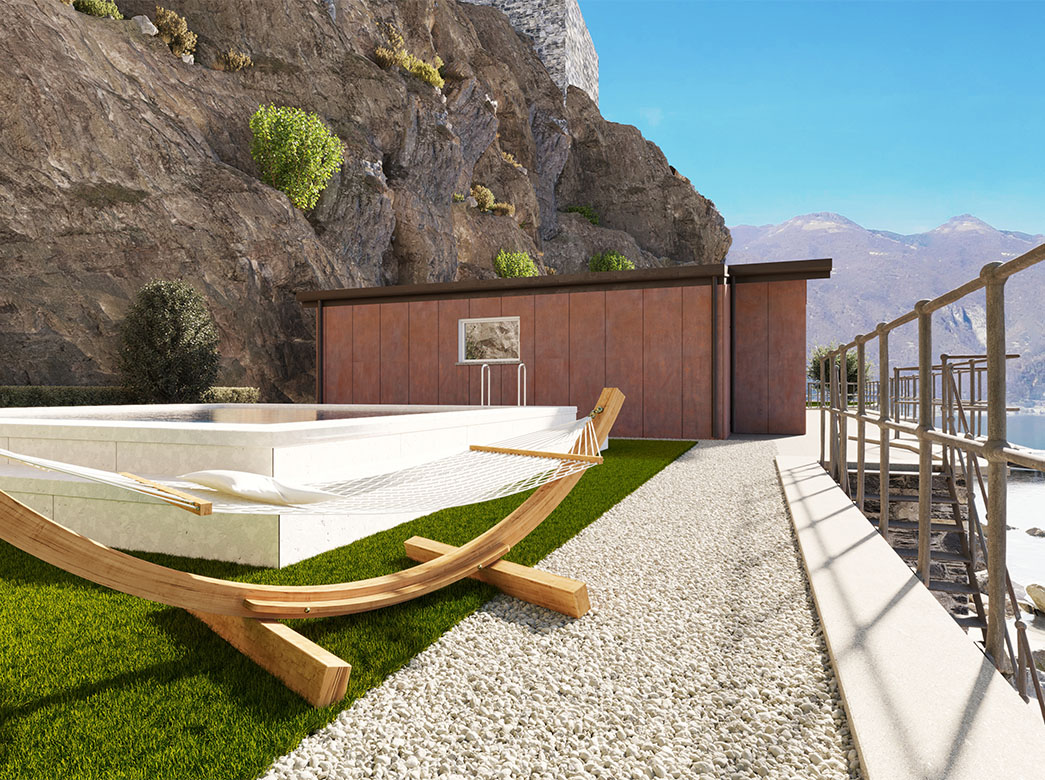 Completa la proprietà il giardino di circa 1.200 mq. con un fronte lago lineare di metri 50, completamente pianeggiante attorno alla villa; mentre sul retro sale roccioso fino alla strada carraia statale dove è in corso di realizzazione il parcheggio privato scoperto per 5 automobili di grossa cilindrata e l’ascensore panoramico sasso e vetro che si collega alla Villa quota lago!!