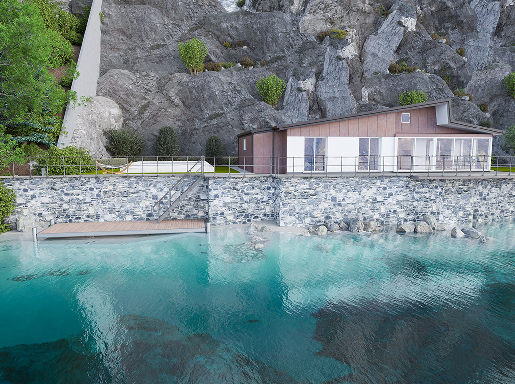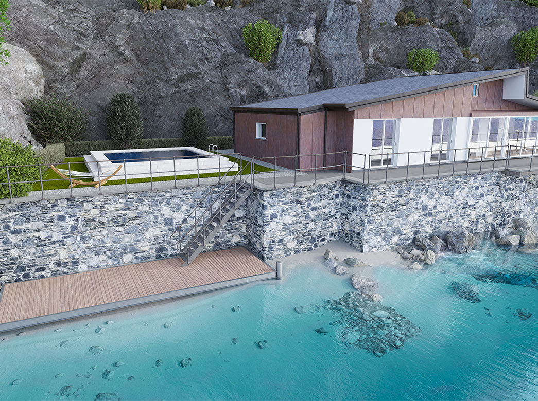 Possibilità di realizzare una piscina fuori terra e un pontile attracco per 2 imbarcazioni (come indicato nel rendering): in corso di richiesta il parere agli enti e dunque il progetto NON è approvato; oneri e costi a carico futuro acquirente!